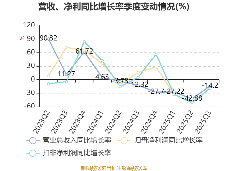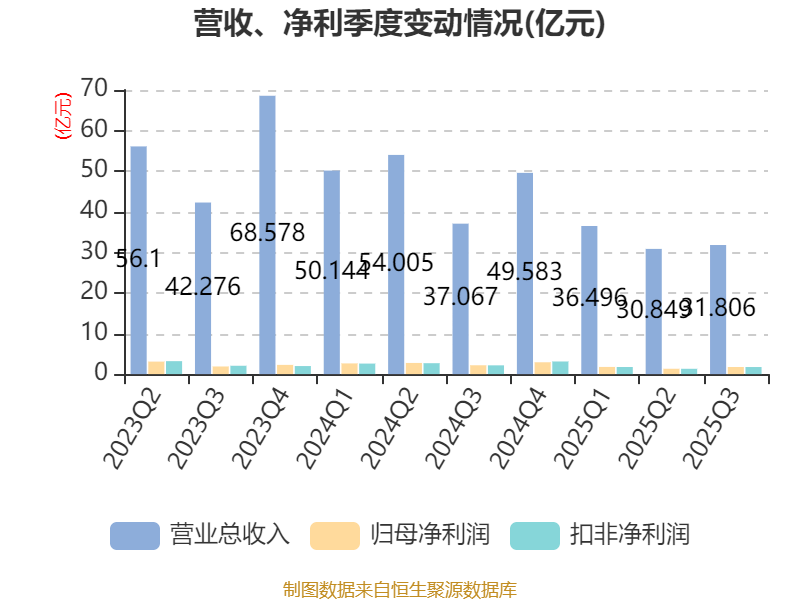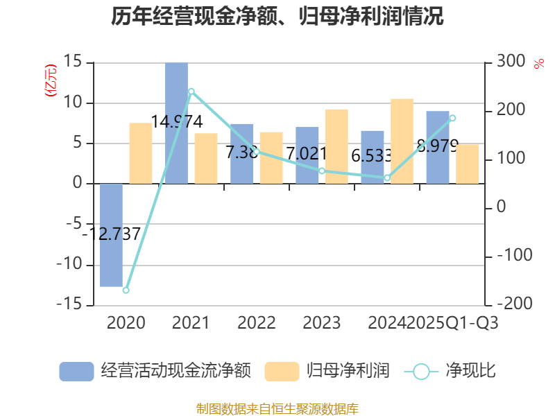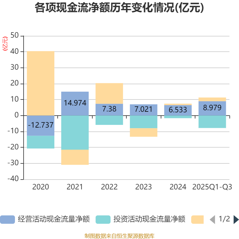 2025年前三季度,公司经营活动现金流净额为8.98亿元,同比增加13.55亿元;筹资活动现金流净额2.32亿元,同比增加3295.16万元;投资活动现金流净额-7.83亿元,上年同期为-5.24亿元。