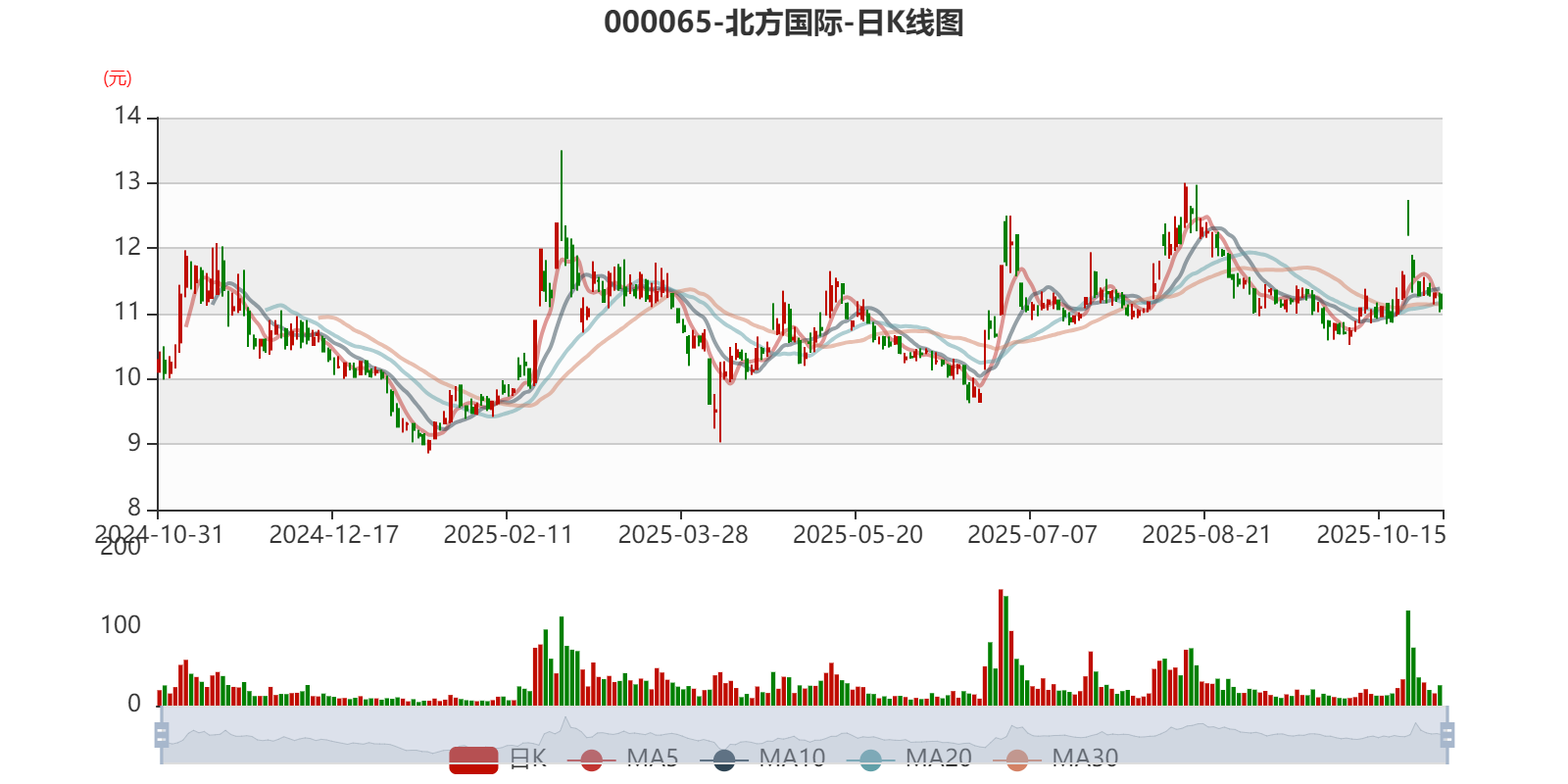 中证智能财讯北方国际(000065)10月31日披露2025年第三季度报告。前三季度公司实现营业总收入99.15亿元,同比下降29.79%;归母净利润4.85亿元,同比下降36.02%;扣非净利润4.81亿元,同比下降35.43%;经营活动产生的现金流量净额为8.98亿元,上年同期为-4.57亿元;报告期内,北方国际基本每股收益为0.46元,加权平均净资产收益率为4.96%。