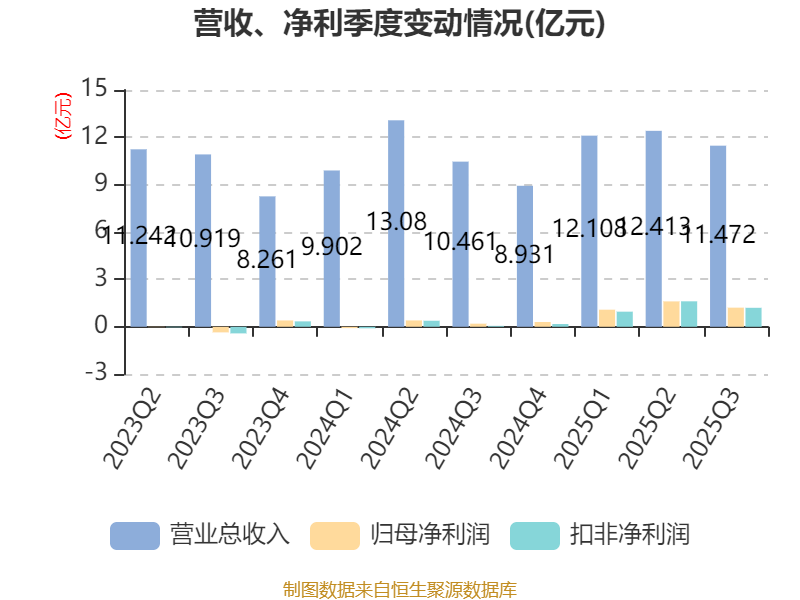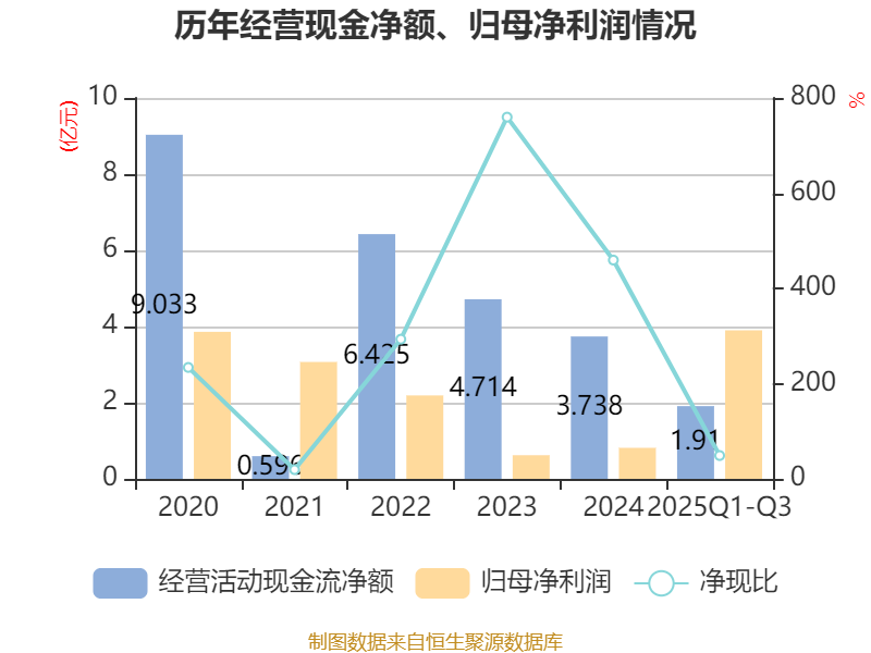 2025年前三季度,公司经营活动现金流净额为1.91亿元,同比增加2.89亿元;筹资活动现金流净额-2.7亿元,同比减少2.18亿元;投资活动现金流净额-3997.05万元,上年同期为-9262.97万元。