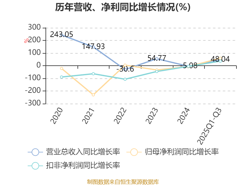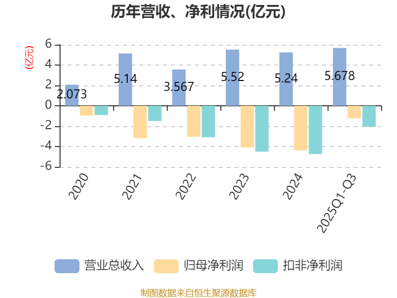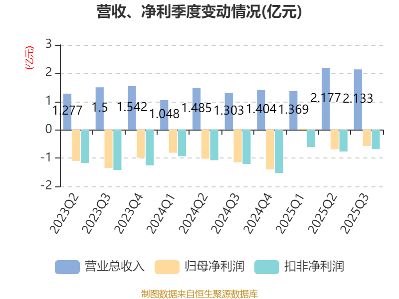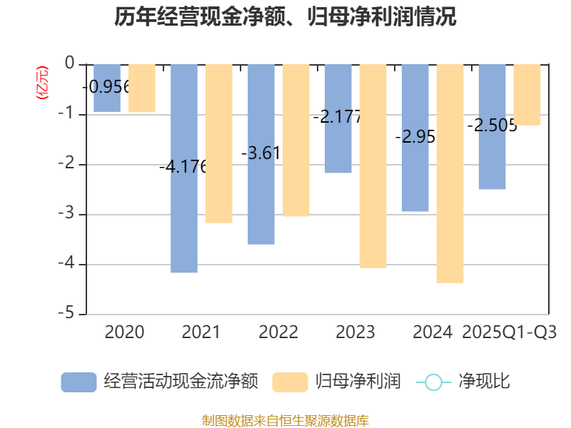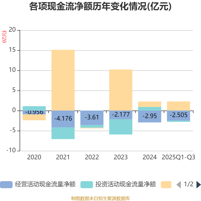 2025年前三季度,公司经营活动现金流净额为-2.5亿元,同比增加2418.55万元;筹资活动现金流净额2.27亿元,同比增加1.19亿元;投资活动现金流净额-3082.02万元,上年同期为1.2亿元。