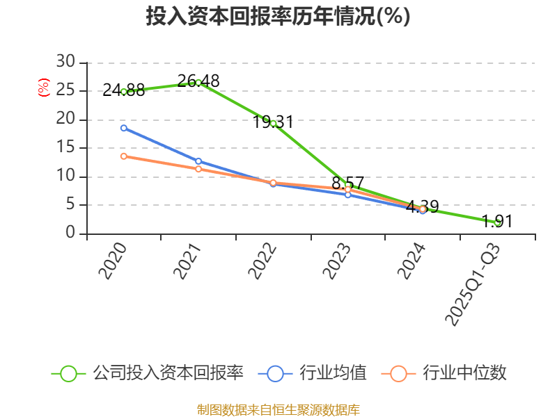 盈利能力方面, 2025年前三季度公司加权平均净资产收益率为2.51%,同比下降0.67个百分点。公司2025年前三季度投入资本回报率为1.91%,较上年同期下降0.91个百分点。