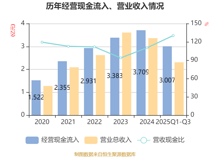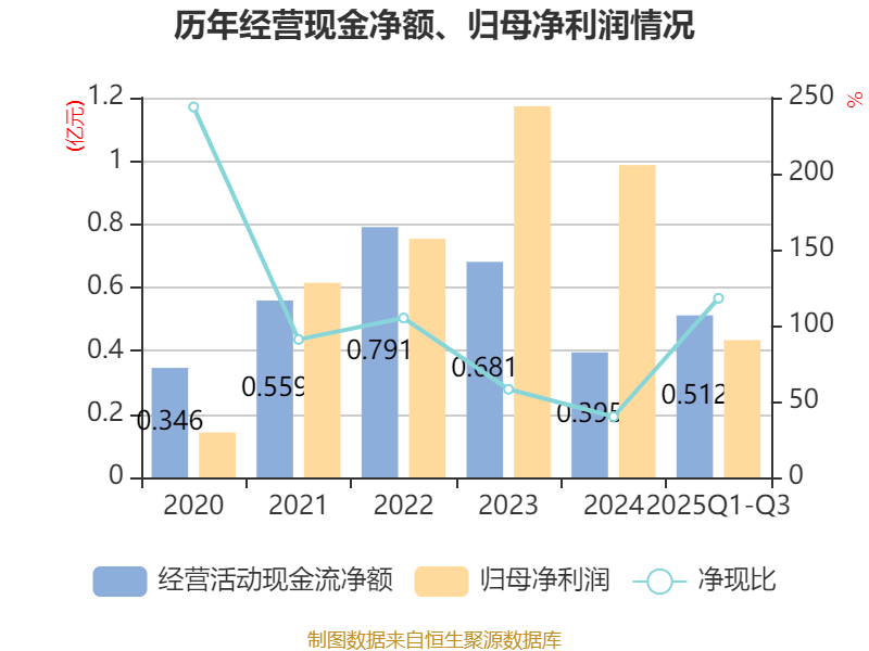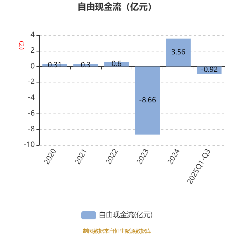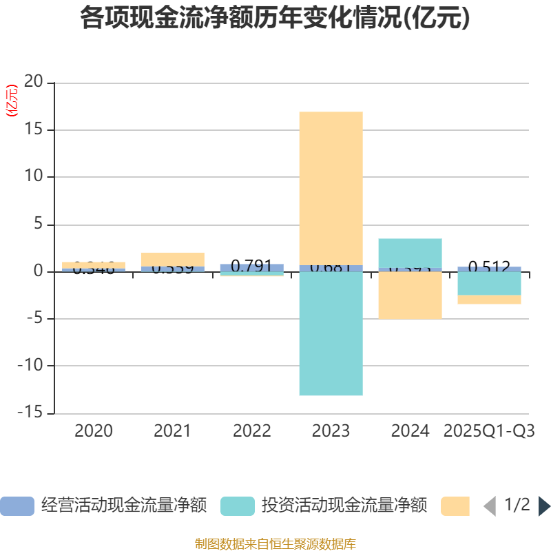 2025年前三季度,公司经营活动现金流净额为5116.22万元,同比增加9565.14万元;筹资活动现金流净额-9325.88万元,同比增加3.46亿元;投资活动现金流净额-2.51亿元,上年同期为3773.53万元。