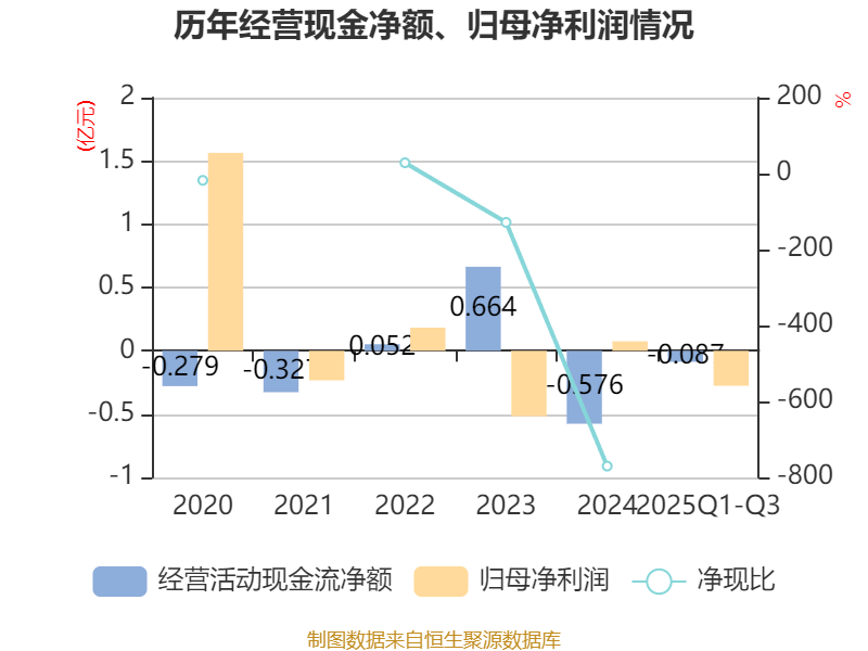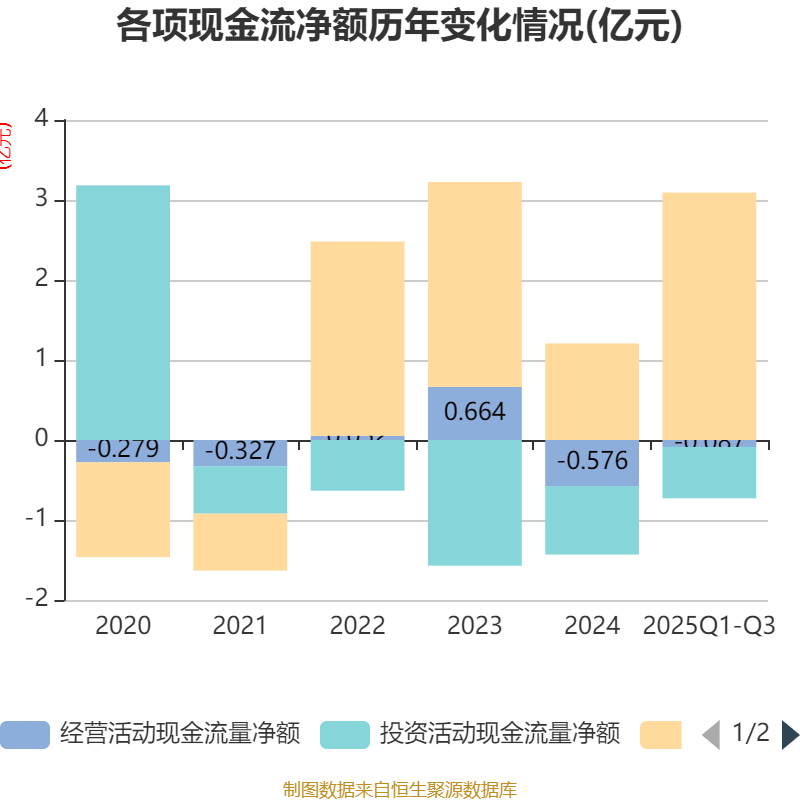 2025年前三季度,公司经营活动现金流净额为-867.66万元,同比增加1.29亿元;筹资活动现金流净额3.09亿元,同比增加2.44亿元;投资活动现金流净额-6424.22万元,上年同期为-4953.5万元。