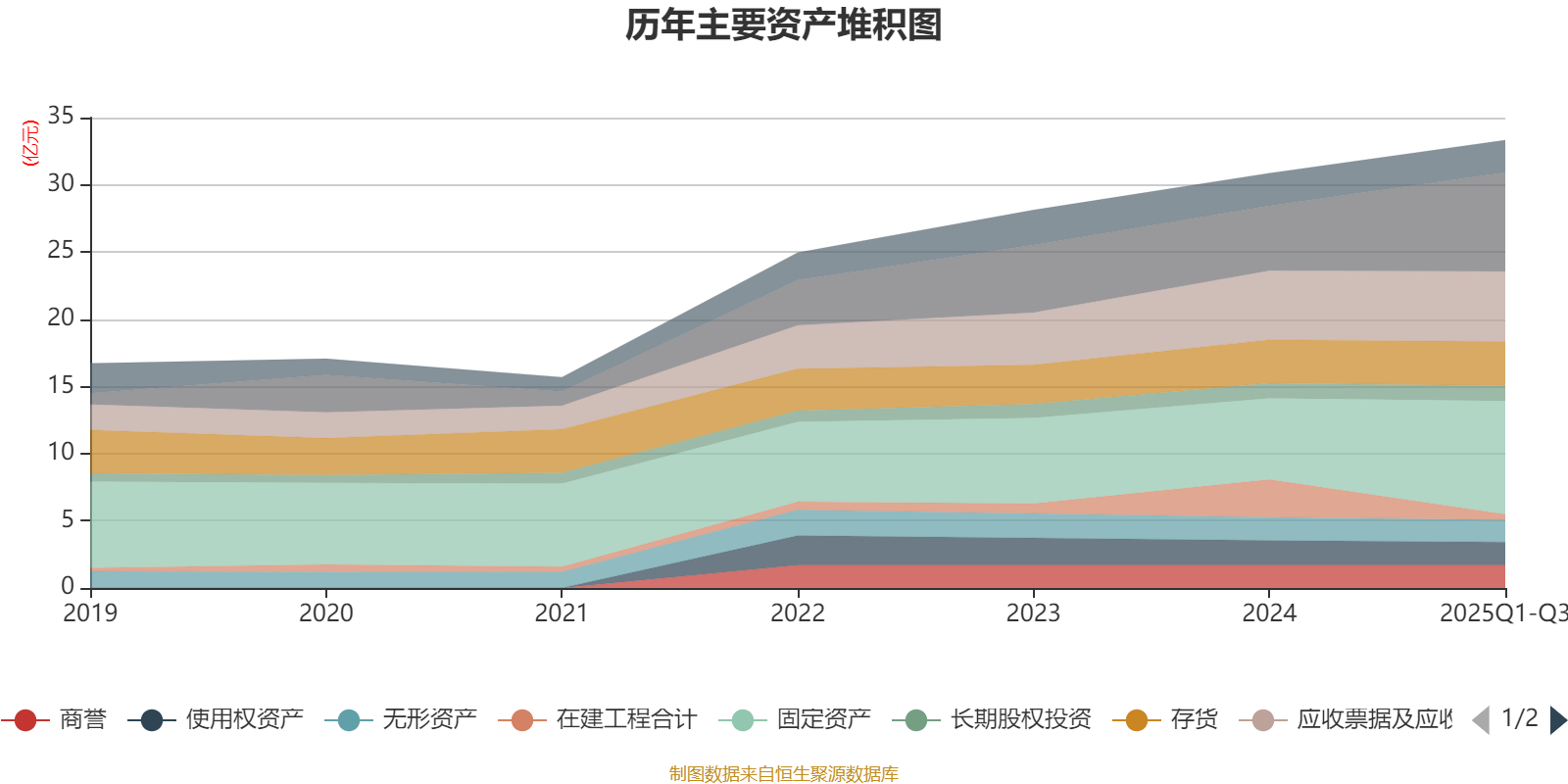 资产重大变化方面,截至2025年三季度末,公司在建工程合计较上年末减少84.95%,占公司总资产比重下降7.81个百分点;货币资金较上年末增加52.46%,占公司总资产比重上升6.45个百分点;固定资产较上年末增加39.35%,占公司总资产比重上升5.69个百分点;合同资产较上年末增加246.56%,占公司总资产比重上升1.27个百分点。