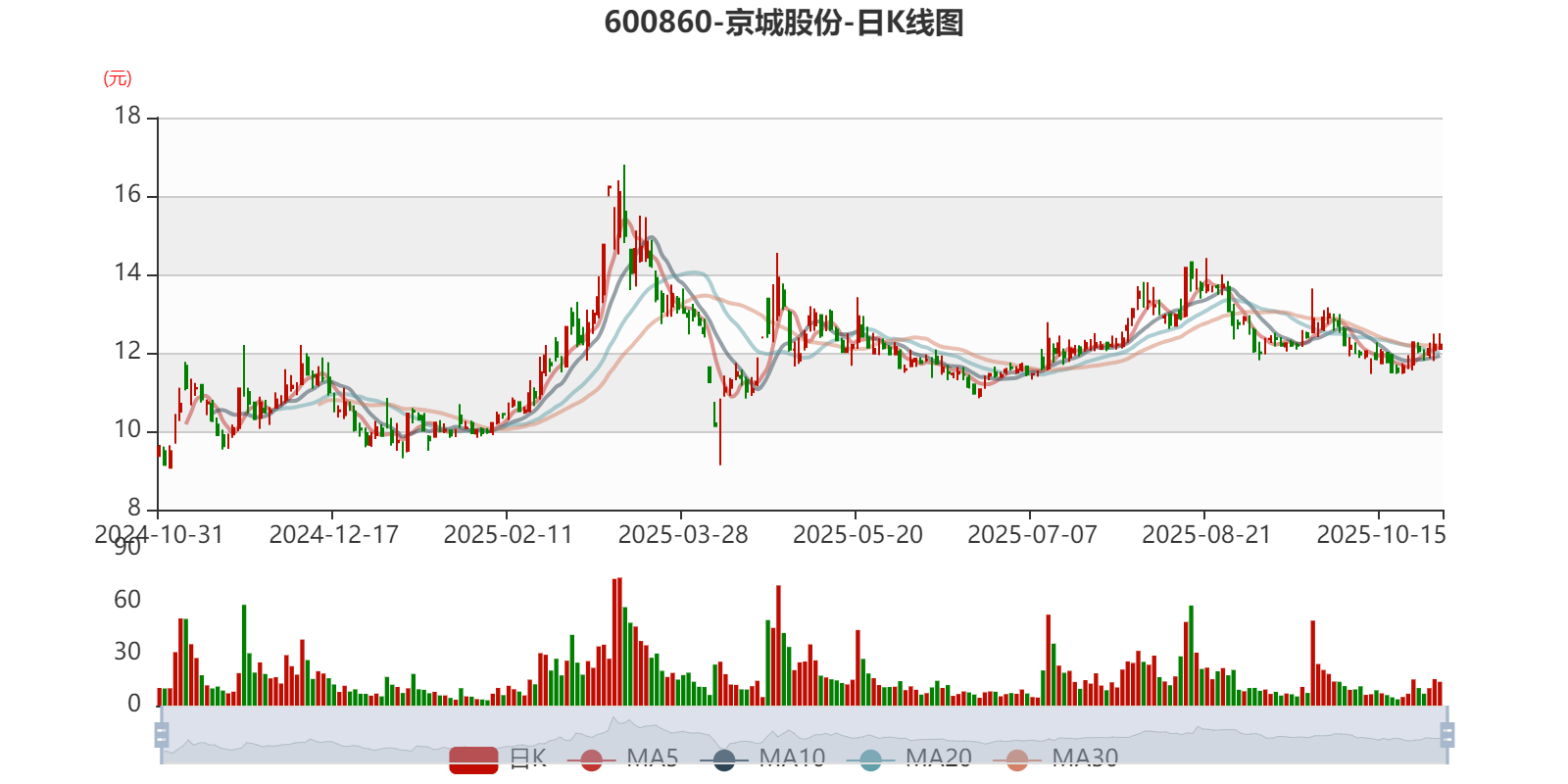 中证智能财讯京城股份(600860)10月31日披露2025年第三季度报告。前三季度公司实现营业总收入10.81亿元,同比下降3.00%;归母净利润亏损2761.02万元,上年同期亏损1606.67万元;扣非净利润亏损4349.83万元,上年同期亏损2825.89万元;经营活动产生的现金流量净额为-867.66万元,上年同期为-1.37亿元;报告期内,京城股份基本每股收益为-0.05元,加权平均净资产收益率为-2.58%。