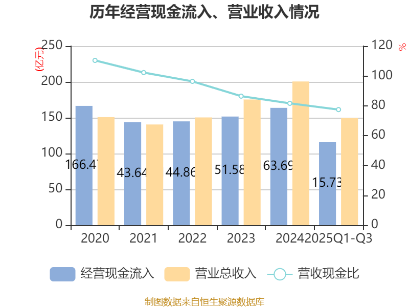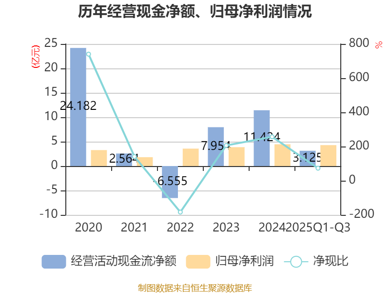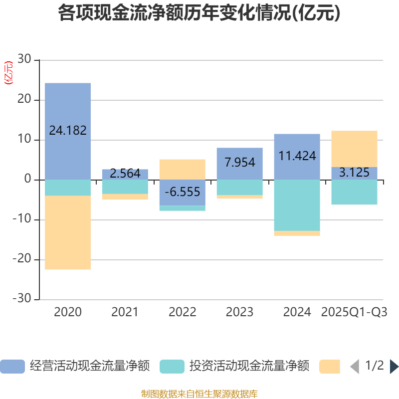 2025年前三季度,公司经营活动现金流净额为3.13亿元,同比增长64.45%;筹资活动现金流净额9.1亿元,同比增加10.63亿元;投资活动现金流净额-6.27亿元,上年同期为-6.6亿元。
