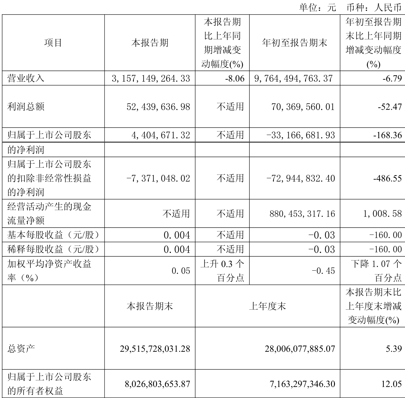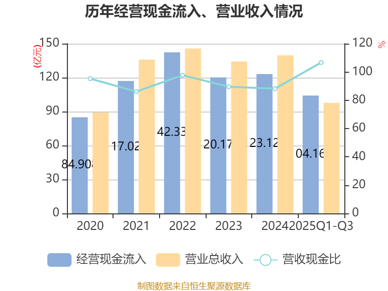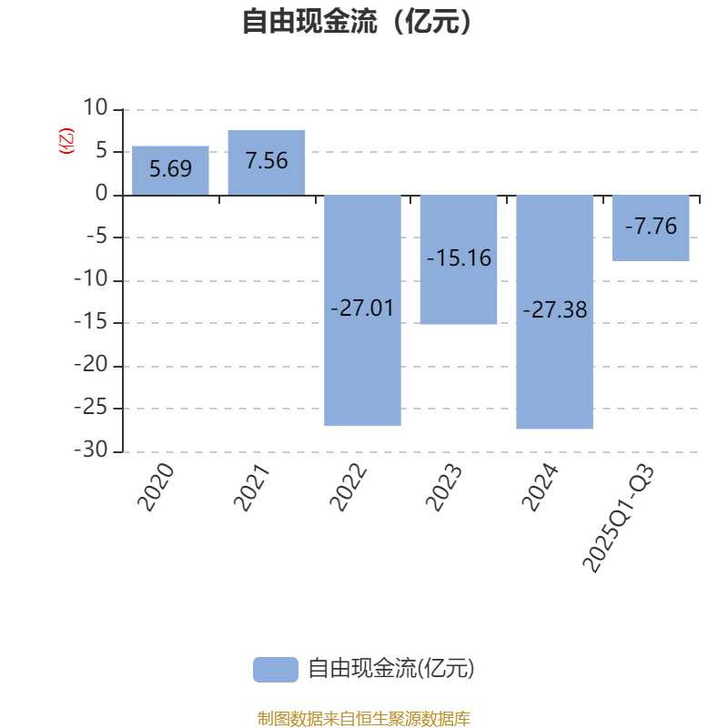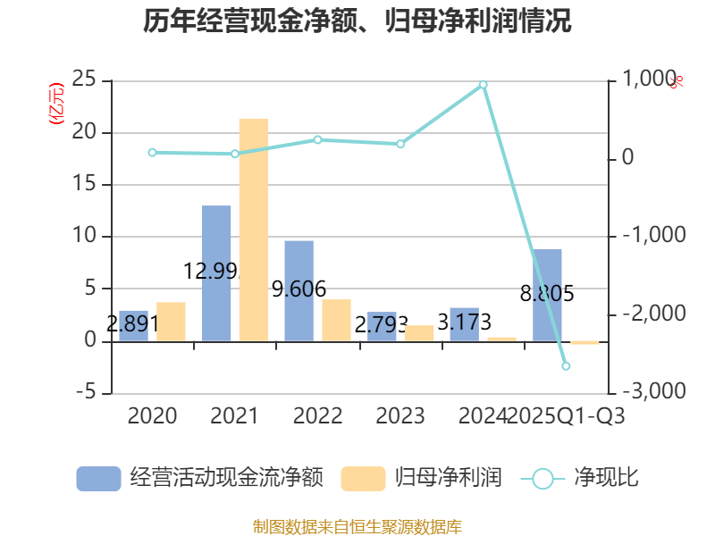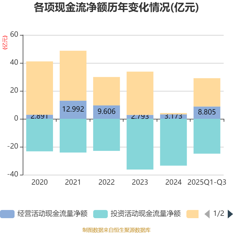 2025年前三季度,公司经营活动现金流净额为8.8亿元,同比增长1008.58%;筹资活动现金流净额20.27亿元,同比增加16.34亿元;投资活动现金流净额-24.91亿元,上年同期为-23.68亿元。