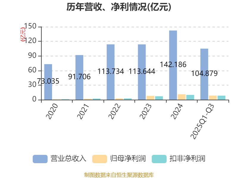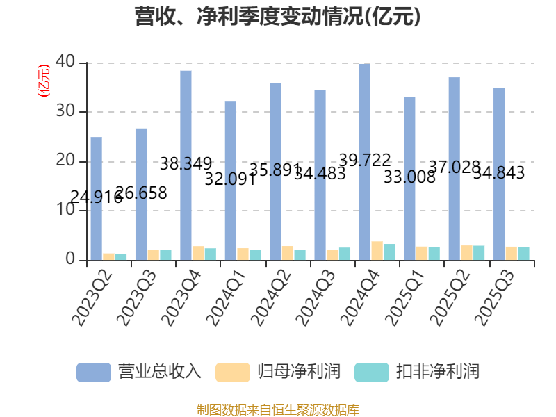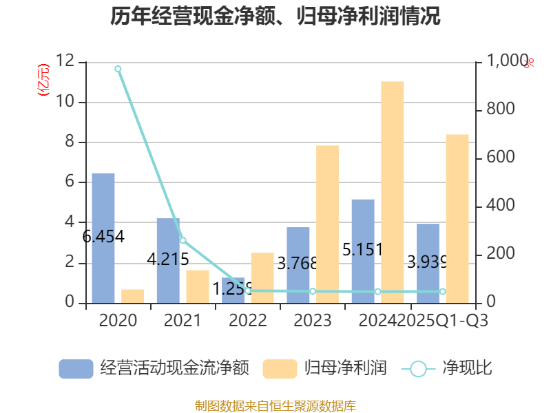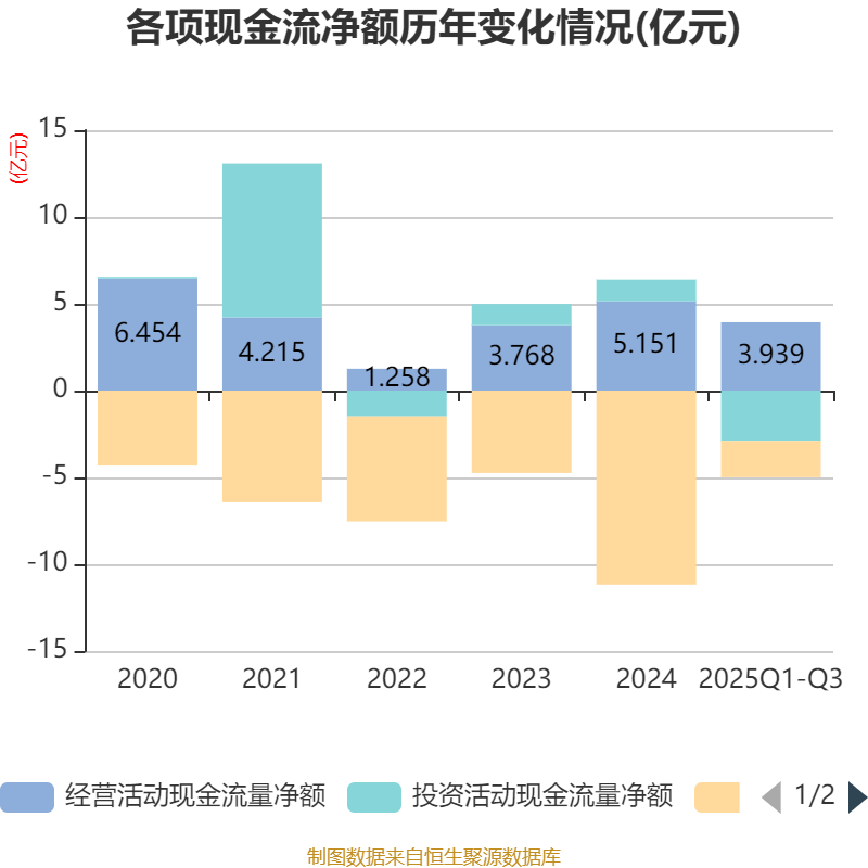 2025年前三季度,公司经营活动现金流净额为3.94亿元,同比下降31.59%;筹资活动现金流净额-2.1亿元,同比增加2.27亿元;投资活动现金流净额-2.89亿元,上年同期为9101.14万元。