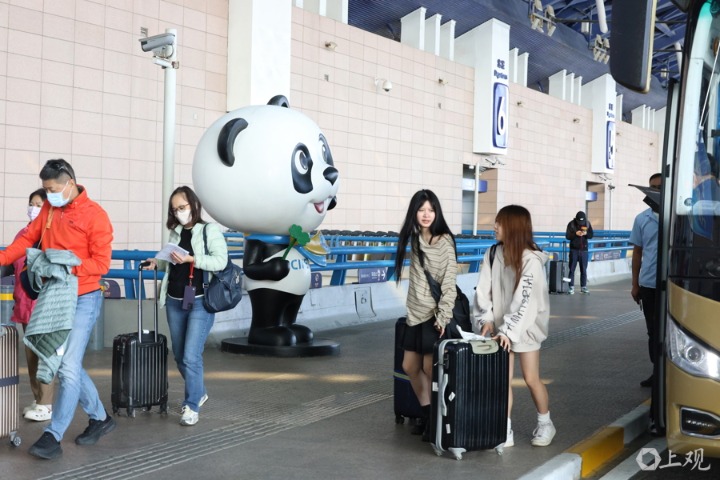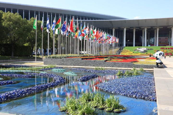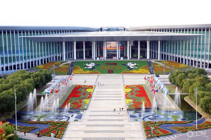 今年南广场延续‘云山—梯田花海—河流—现代城市花园’空间脉络,保留广受认可的熊猫进宝等进博会标志元素与结构框架。