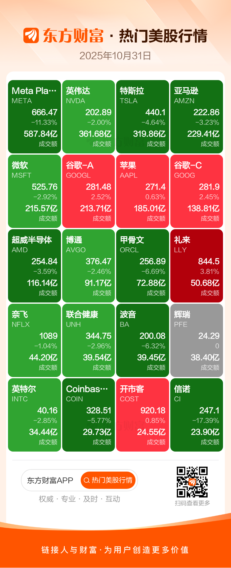 Meta Platforms Inc-A跌11.33%,英伟达跌2.00%,特斯拉跌4.64%,亚马逊跌3.23%,微软跌2.92%,谷歌-A涨2.52%,苹果涨0.63%,谷歌-C涨2.45%,超威半导体跌3.59%,博通跌2.46%。