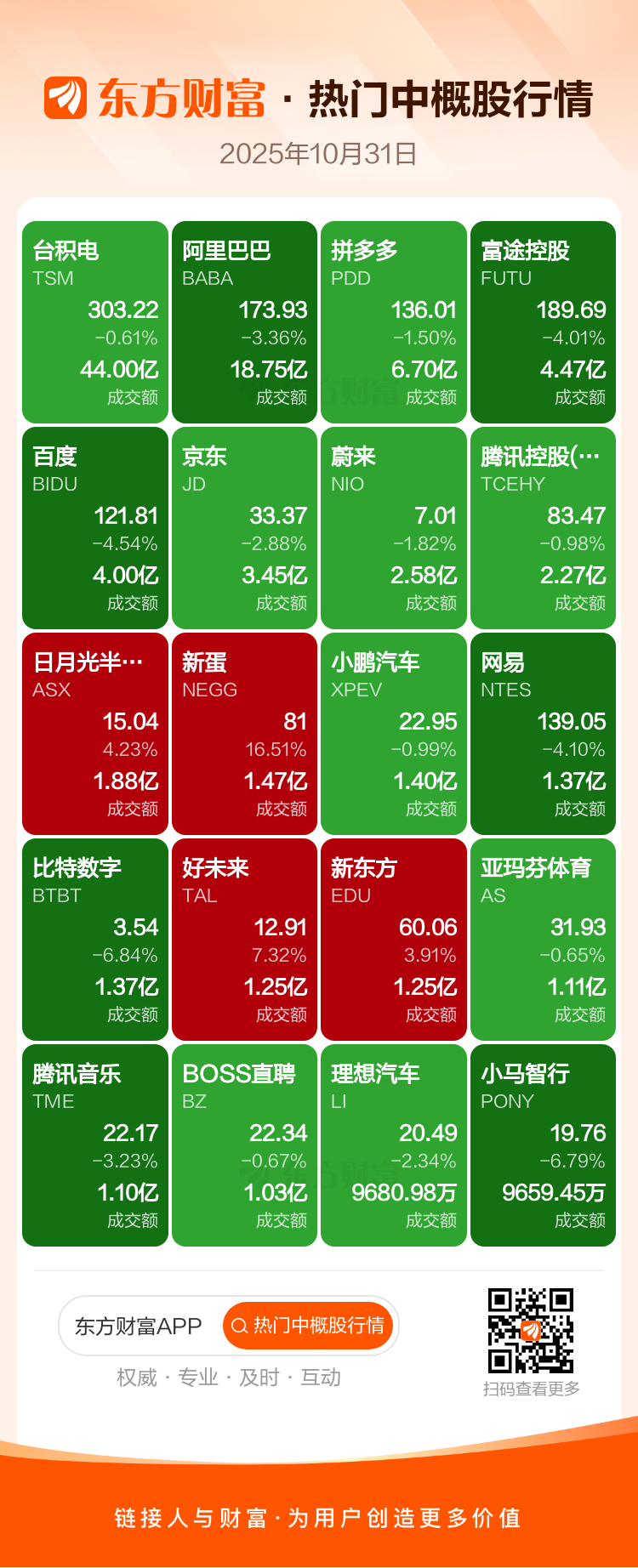 台积电跌0.61%,阿里巴巴跌3.36%,拼多多跌1.50%,富途控股跌4.01%,百度跌4.54%,京东跌2.88%,蔚来跌1.82%,腾讯控股(ADR)跌0.98%,日月光半导体涨4.23%,新蛋涨16.51%。