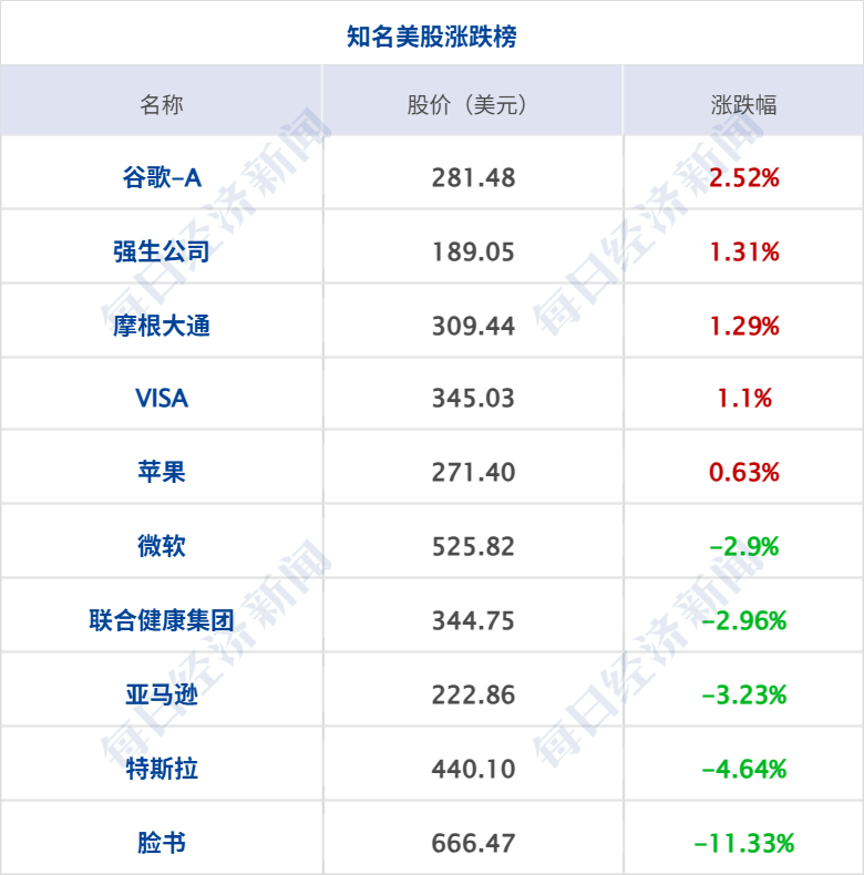 美股三大指数集体收跌,纳指跌1.57%,标普500指数跌0.99%,道指跌0.23%;Meta跌超11%,为三年以来最大单日跌幅,市值蒸发约2140亿美元(约合人民币15216亿元);特斯拉跌超4%,亚马逊跌逾3%,微软、英伟达跌超2%,奈飞跌超1%;谷歌涨超2%,苹果小幅上涨。纳斯达克中国金龙指数跌1.88%,中概股多数下跌,哔哩哔哩跌超5%,网易跌超4%,阿里巴巴跌超3%,京东跌近3%;新东方涨近4%。