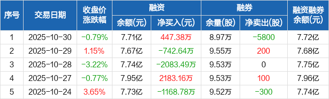 融资方面,当日融资买入3442.57万元,融资偿还2995.19万元,融资净买入447.38万元。融券方面,融券卖出0股,融券偿还5800股,融券余量8.97万股,融券余额78.58万元。融资融券余额合计7.72亿元。
