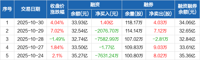 中国铝业融资融券信息显示,2025年10月30日融资净买入1.4亿元;融资余额33.93亿元,较前一日增加4.3%。