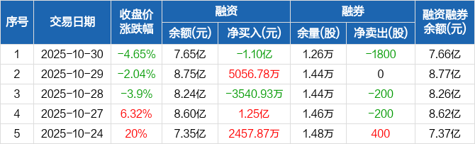 普冉股份:融资净偿还1.1亿元,融资余额7.65亿元(10-30)