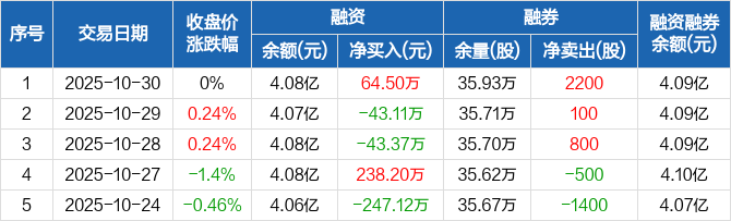融资方面,当日融资买入696.72万元,融资偿还632.22万元,融资净买入64.5万元。融券方面,融券卖出2300股,融券偿还100股,融券余量35.93万股,融券余额152.7万元。融资融券余额合计4.09亿元。