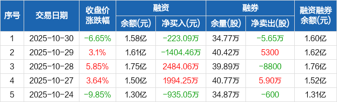融资方面,当日融资买入3686.12万元,融资偿还3909.21万元,融资净偿还223.09万元。融券方面,融券卖出500股,融券偿还5.7万股,融券余量34.77万股,融券余额151.25万元。融资融券余额合计1.6亿元。