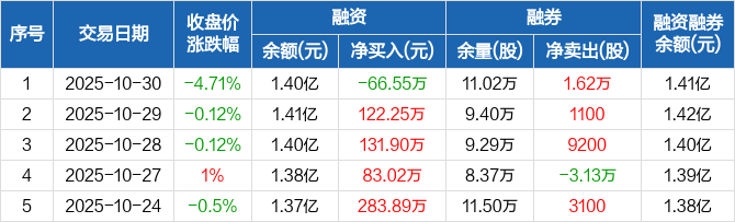 禾丰股份:融资净偿还66.55万元,融资余额1.4亿元(10-30)
