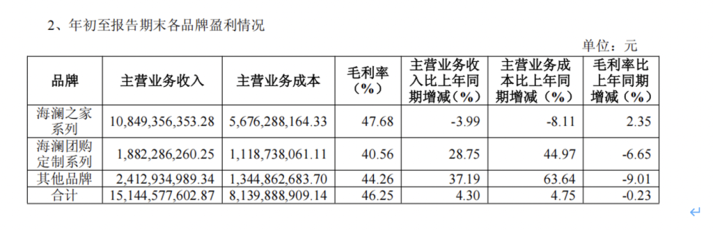 财报显示,前三季度,海澜之家主品牌实现销售108.49亿元,同比下降 3.99%,毛利率同比增长2.35%至47.68%;海澜团购定制系列收入18.82亿元,同比提升28.75%,成为增长亮点,但该业务毛利率同比下降6.65%至40.56%;其他品牌实现主营业务收入24.13亿元,同比提升37.19%,毛利率同比下降9.01%至44.26%。