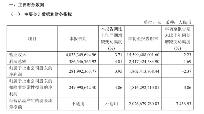 海澜之家前三季度营收155.99亿元,同比增长2.23%;归属于上市公司股东净利润18.62亿元,同比减少2.37%;归属于上市公司股东的扣除非经常性损益的净利润18.16亿元,增长3.86%。