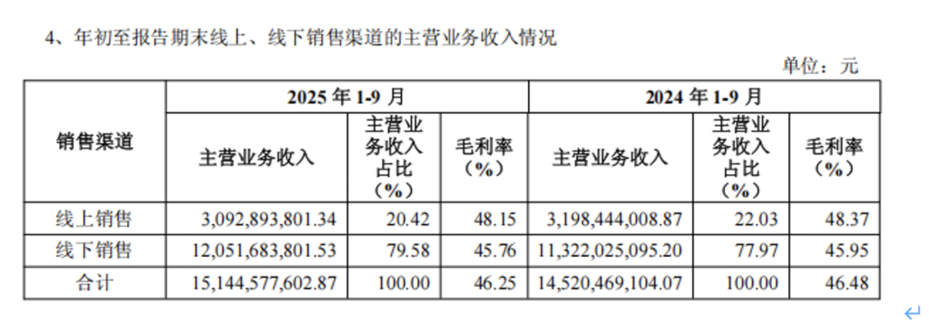 销售渠道表现方面,线下销售已经是海澜之家最主流的渠道,前三季度,线下销售收入120.52亿元,在主营业务收入的占比为79.58%,毛利率45.76%。线上销售收入30.93亿元,占比20.42%,毛利率为48.15%。