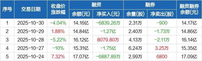 融资方面,当日融资买入2.32亿元,融资偿还3.01亿元,融资净偿还6839.26万元。融券方面,融券卖出3300股,融券偿还4200股,融券余量2.31万股,融券余额127.14万元。融资融券余额合计14.17亿元。