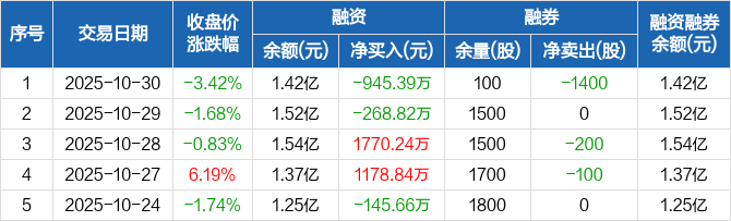 启迪环境融资融券信息显示,2025年10月30日融资净偿还945.39万元;融资余额1.42亿元,较前一日下降6.24%。