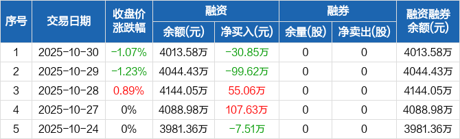 仁信新材:融资净偿还30.85万元,融资余额4013.58万元(10-30)