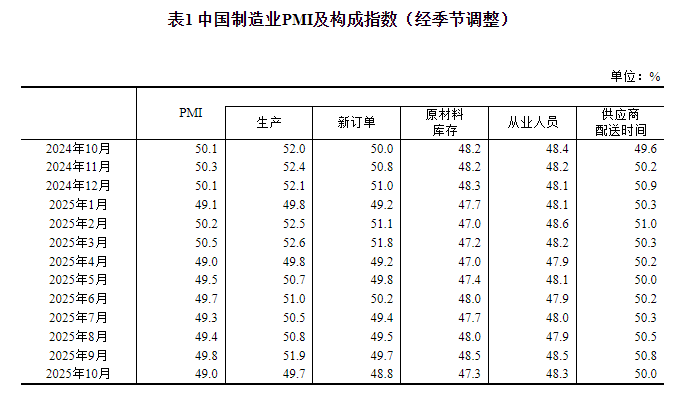 10月份,制造业采购经理指数为49.0%,比上月下降0.8个百分点;非制造业商务活动指数为50.1%,比上月上升0.1个百分点;综合PMI产出指数为50.0%,比上月下降0.6个百分点,我国经济总体产出保持总体稳定。