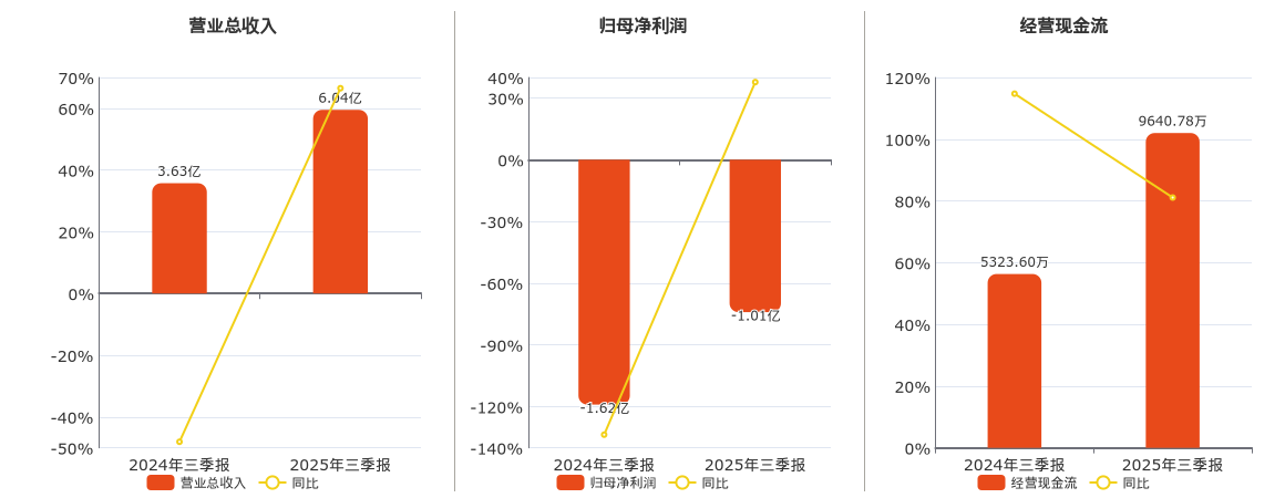 公司营业总收入为6.04亿元。归母净利润为-1.01亿元,在已披露的同业公司中排名第113。经营活动现金净流入为9640.78万元。