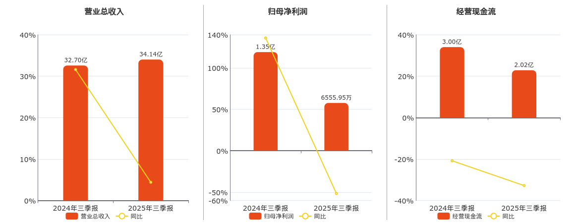 公司营业总收入为34.14亿元,在已披露的同业公司中排名第3,较去年同报告期营业总收入增加1.44亿元,实现3年连续上涨,同比较去年同期上涨4.40%。归母净利润为6555.95万元,在已披露的同业公司中排名第15,较去年同报告期归母净利润减少6966.83万元,同比较去年同期下降51.52%。经营活动现金净流入为2.02亿元,在已披露的同业公司中排名第10,较去年同报告期经营活动现金净流入减少9832.59万元,同比较去年同期下降32.79%。