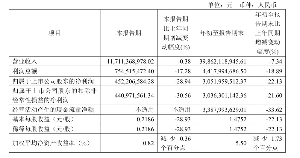 蓝鲸新闻10月30日讯(记者孙煜)10月30日,中国中免发布三季度业绩报告,第三季度营业收入117.11亿元,同比下降0.38%;归母净利润4.52亿元,同比下降28.94%;归母扣非净利润4.41亿元,同比下降30.56%。