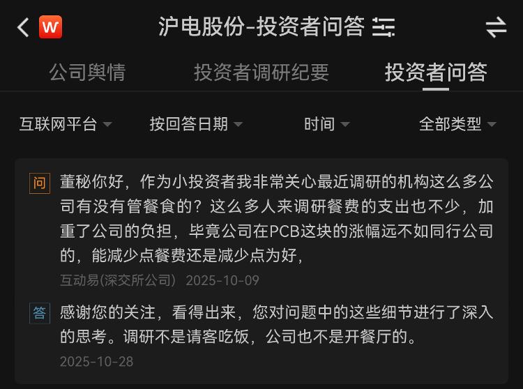 近日,有投资者在互动平台向沪士电子股份有限公司(以下简称“沪电股份”)提问,“最近调研的机构这么多,公司有没有管餐食的?这么多人来调研餐费的支出也不少,加重了公司的负担。”