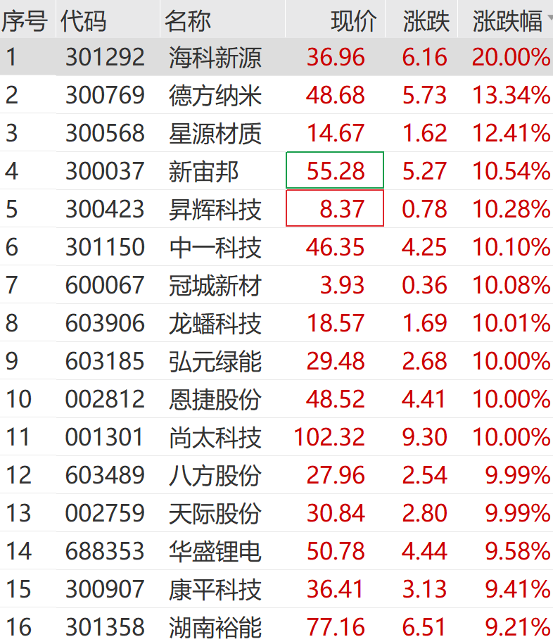 海科新源20cm涨停,弘元绿能、天际股份、恩捷股份等多股涨停,德方纳米、昇辉科技等涨超10%。