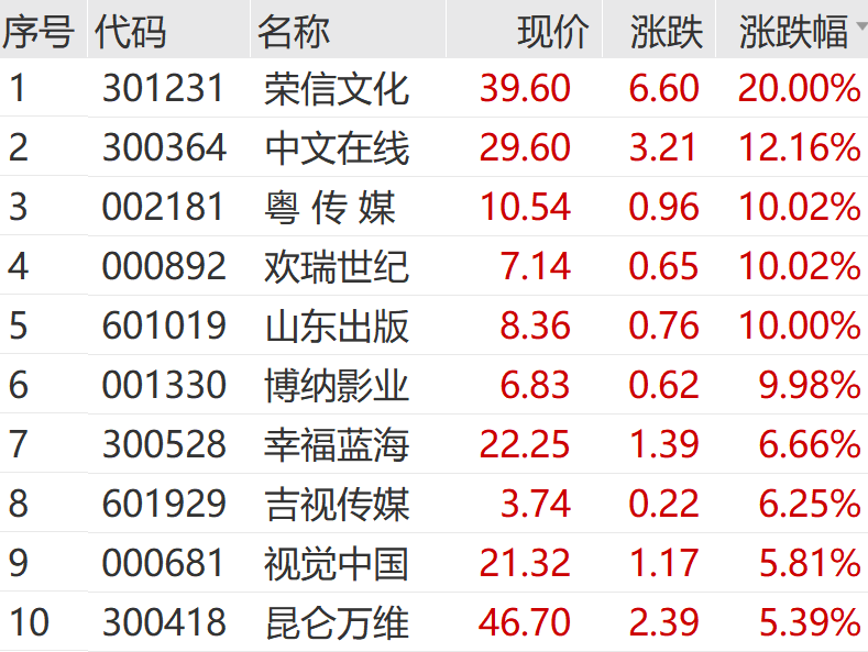 10月31日上午,传媒板块盘中拉升。荣信文化直线拉升,实现20cm涨停;山东出版、粤传媒、欢瑞世纪等涨停,中文在线涨超10%。
