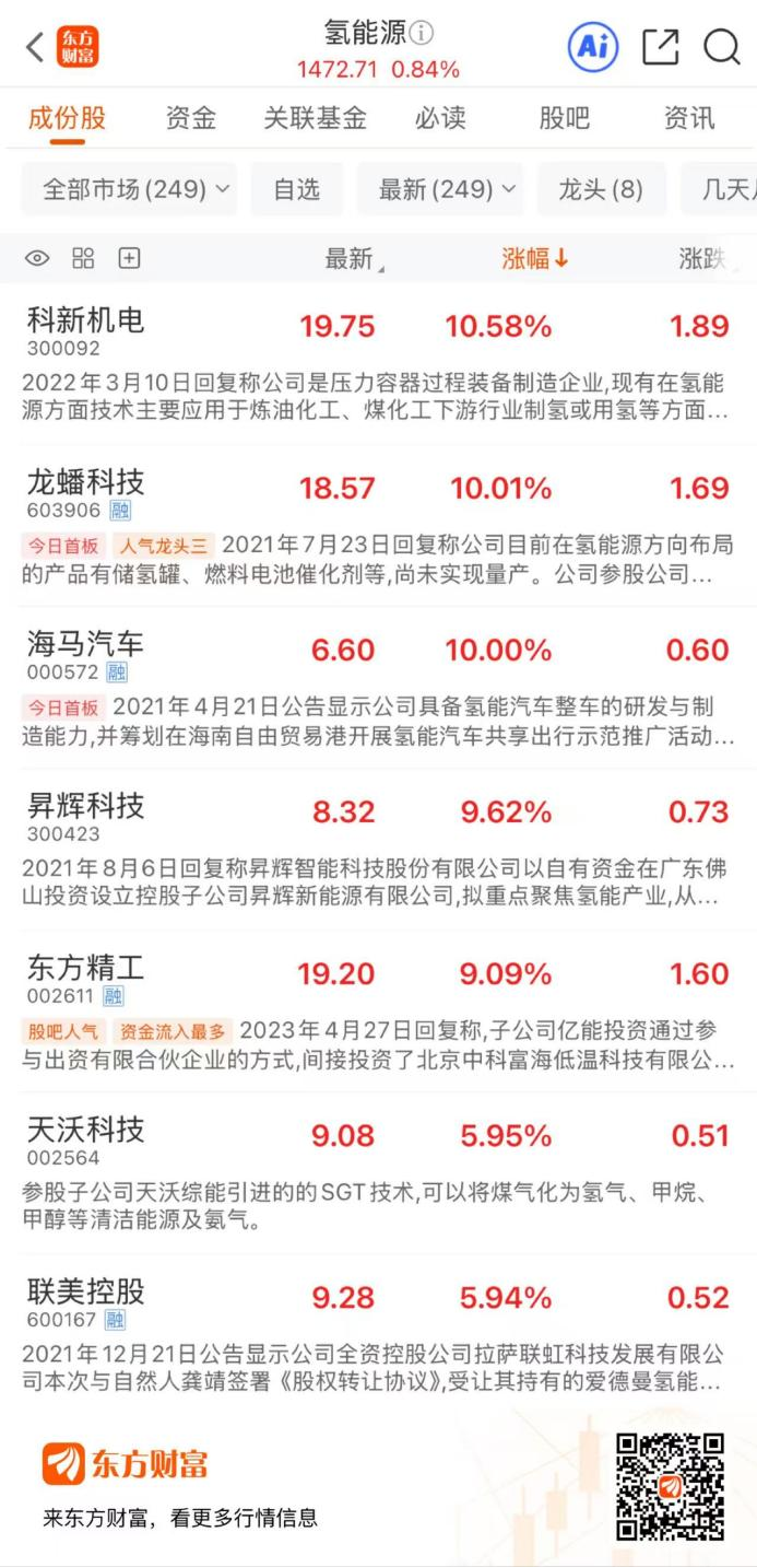 10月31日早盘,氢能源概念股集体异动。截至发稿,科新机电涨超10%,龙蟠科技、海马汽车涨停,昇辉科技、东方精工涨超9%,金龙汽车、天赐材料、信宇人、天沃科技、联美控股、天合光能、福田汽车、永安行等涨超5%。