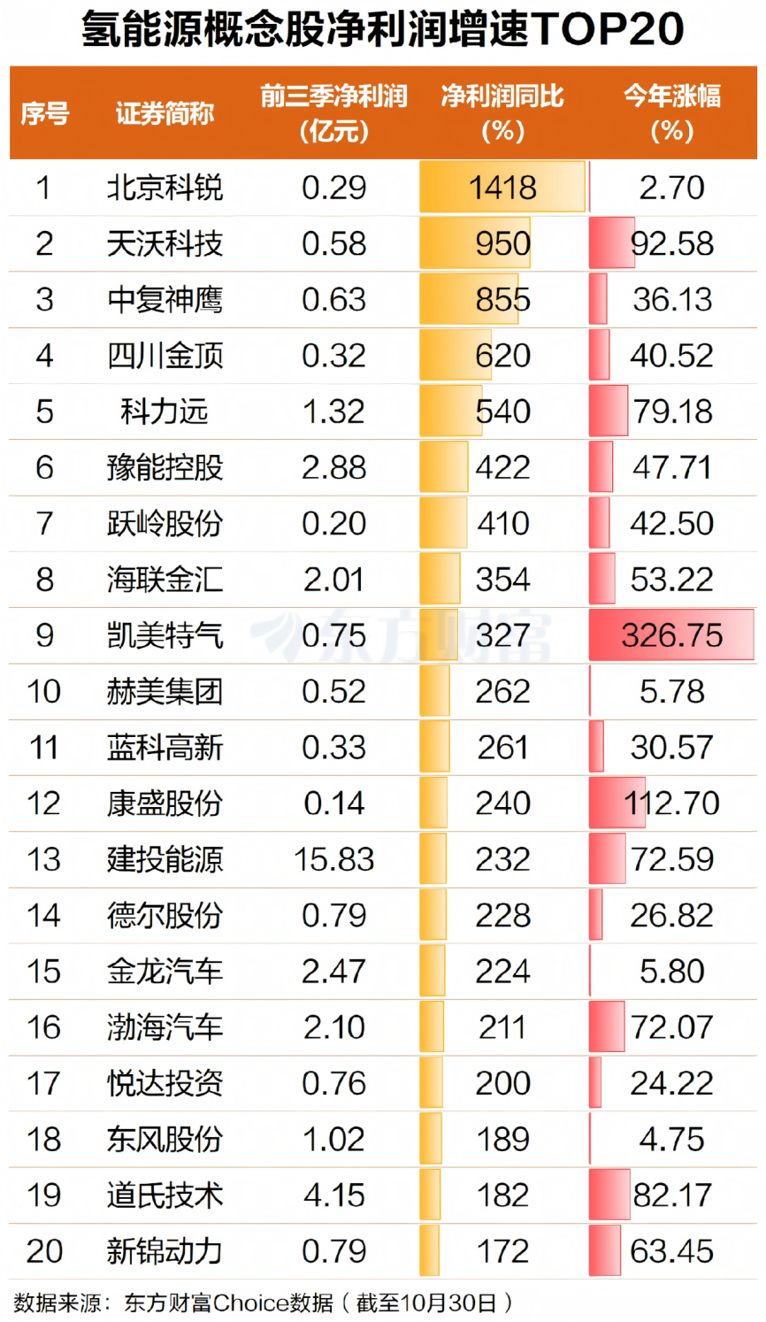 A股方面,氢能源概念股合计超200只,当前相关公司2025年三季报均已披露完毕。其中,前三季度业绩向好的有137只,占比超55%。据东方财富Choice数据,前三季度净利润增速最高的是氢能源概念股北京科锐,同比增长1417.63%;其次是天沃科技,同比增长950.20%。此外,中复神鹰、四川金顶、科力远等前三季度净利润也均同比增长超500%。