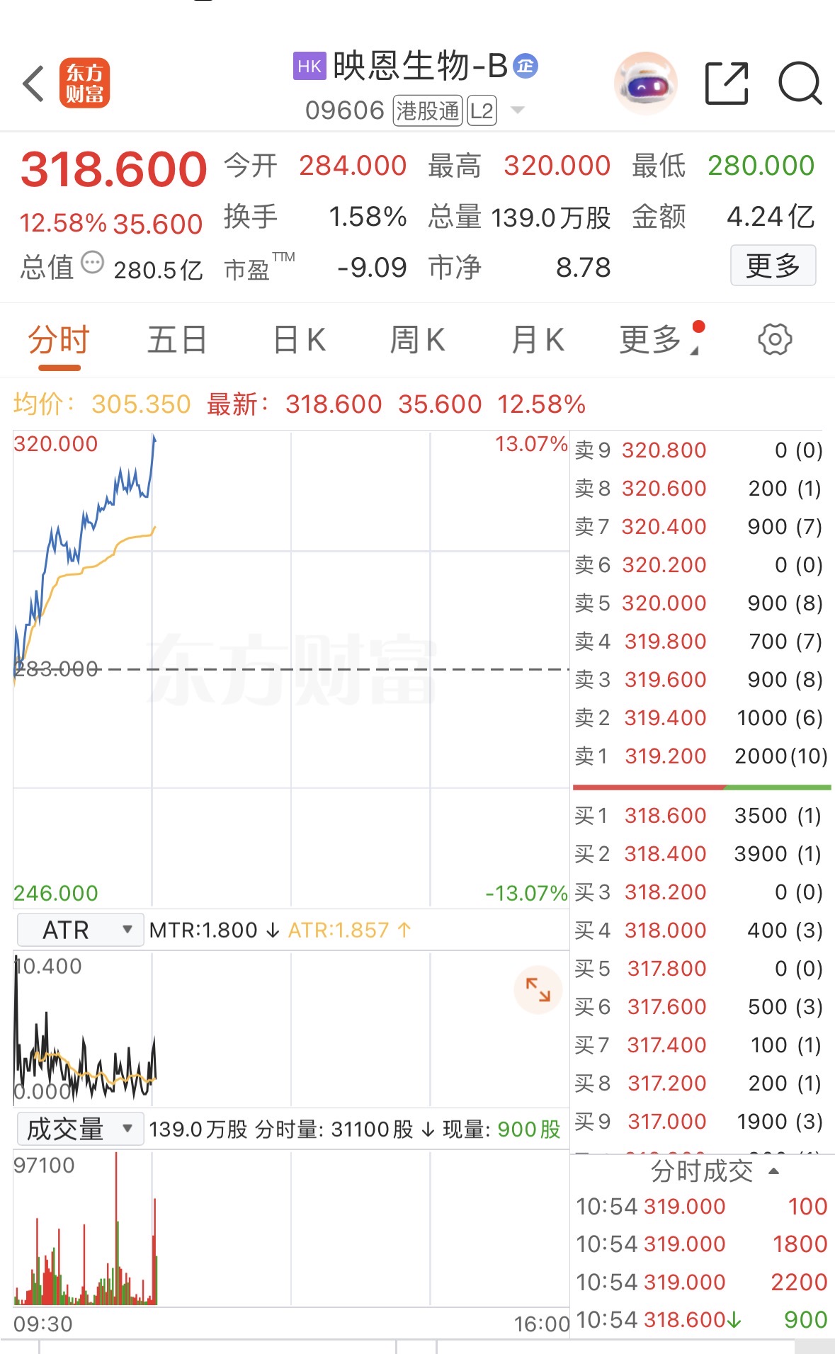 上证报中国证券网讯10月31日,映恩生物-B早盘一路震荡上行,盘中一度涨超13%,最高报320港元/股。截至10时54分记者发稿时,映恩生物-B涨12.58%,报318.6港元/股。