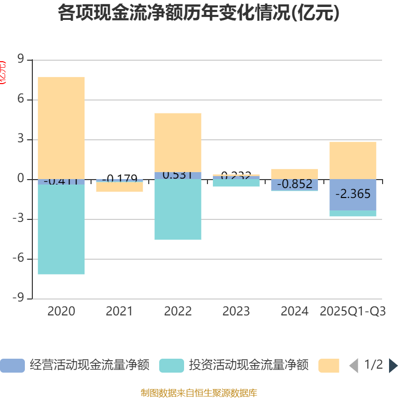 2025年前三季度,公司经营活动现金流净额为-2.36亿元,同比减少2.31亿元;筹资活动现金流净额2.8亿元,同比增加2.87亿元;投资活动现金流净额-4411.66万元,上年同期为-20.73万元。