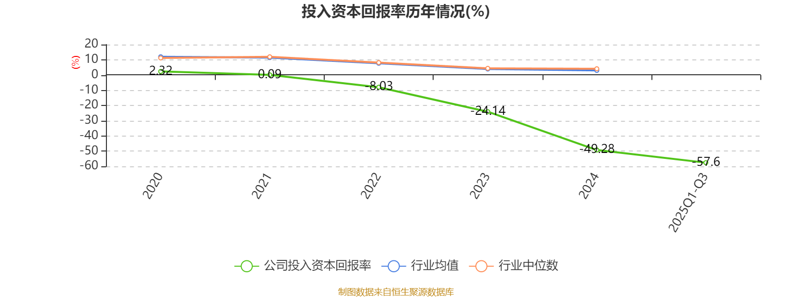 公司2025年前三季度投入资本回报率为-57.6%,较上年同期下降12.42个百分点。