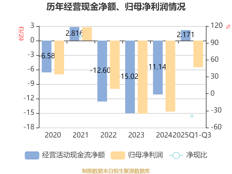 2025年前三季度,公司经营活动现金流净额为2.17亿元,同比增加10.52亿元;筹资活动现金流净额3.71亿元,同比减少8.31亿元;投资活动现金流净额-2.8亿元,上年同期为-4.26亿元。