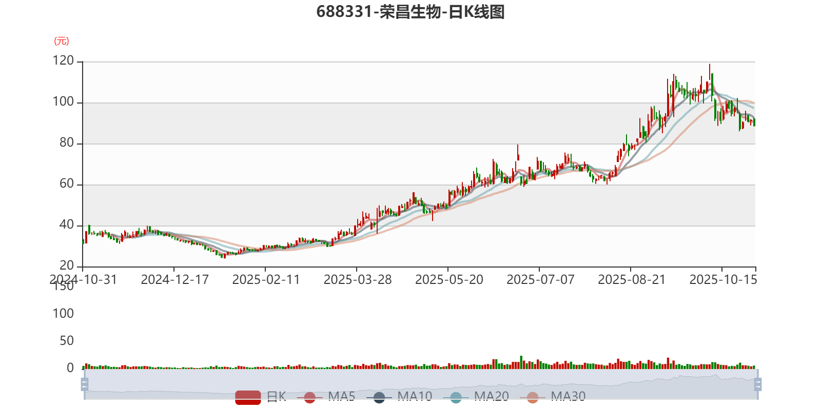 以10月30日收盘价计算,荣昌生物目前市盈率(TTM)约为-52.73倍,市净率(LF)约21.54倍,市销率(TTM)约22.43倍。