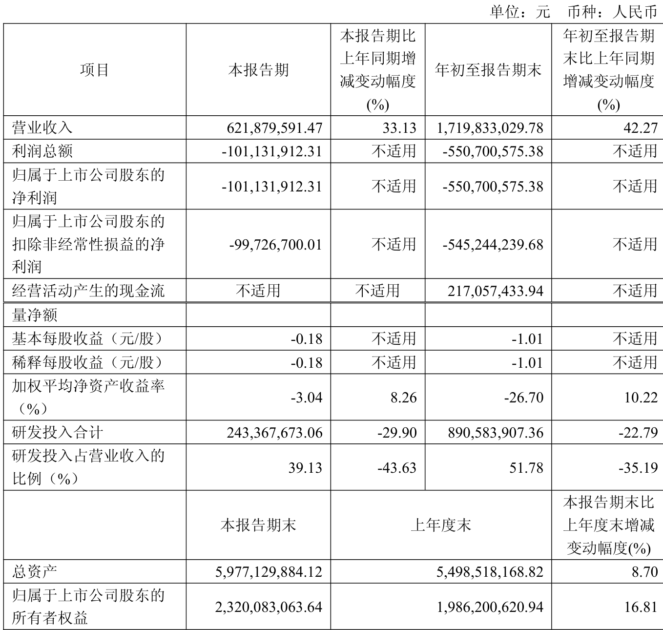 中证智能财讯荣昌生物(688331)10月31日披露2025年第三季度报告。前三季度公司实现营业总收入17.2亿元,同比增长42.27%;归母净利润亏损5.51亿元,上年同期亏损10.71亿元;扣非净利润亏损5.45亿元,上年同期亏损10.97亿元;经营活动产生的现金流量净额为2.17亿元,上年同期为-8.35亿元;报告期内,荣昌生物基本每股收益为-1.01元,加权平均净资产收益率为-26.70%。