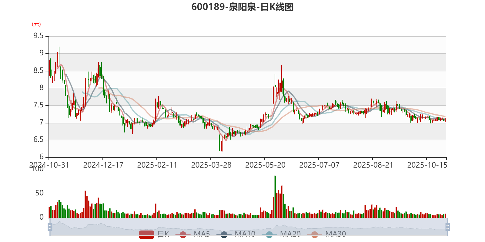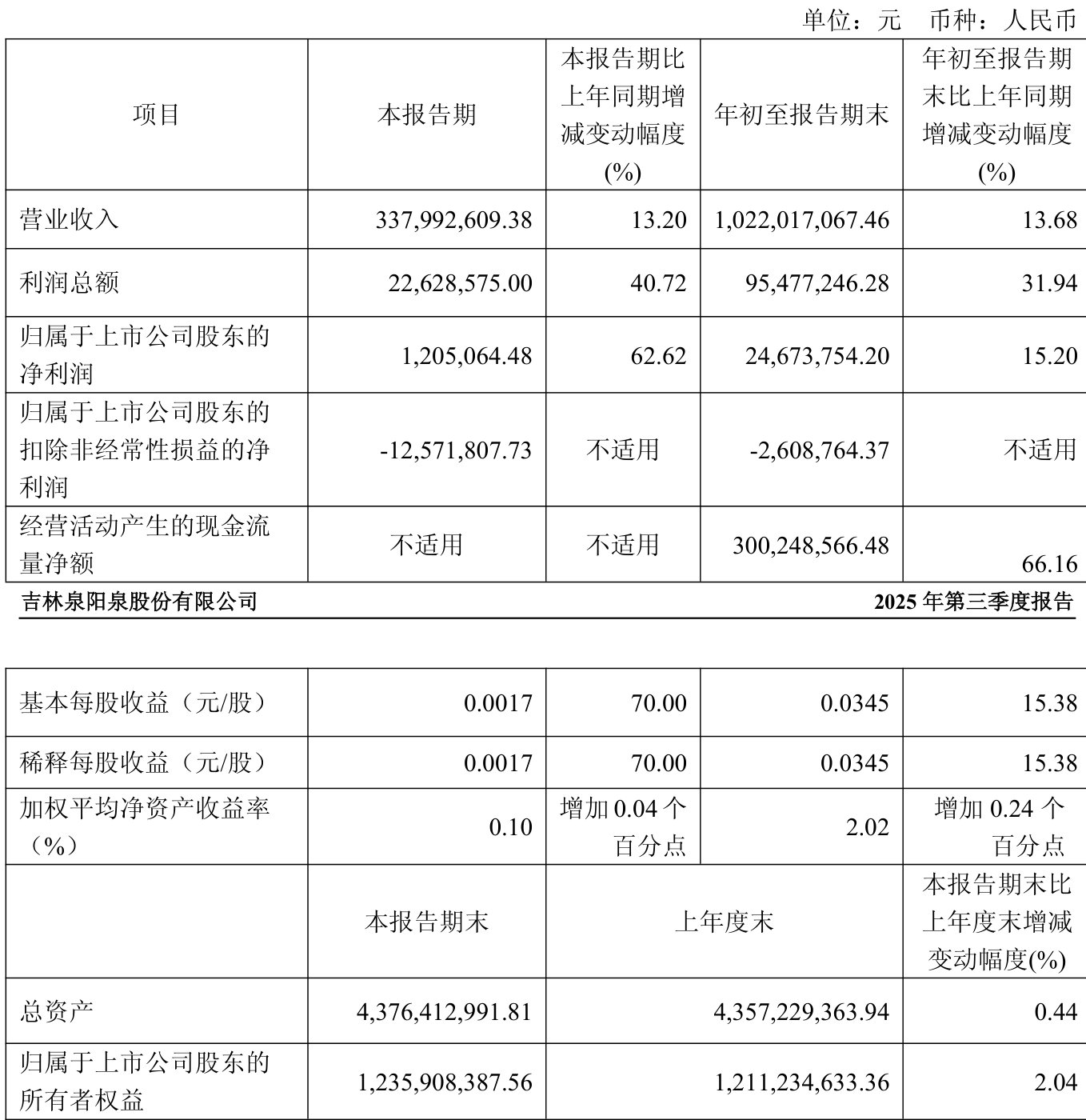 中证智能财讯泉阳泉(600189)10月31日披露2025年第三季度报告。前三季度公司实现营业总收入10.22亿元,同比增长13.68%;归母净利润2467.38万元,同比增长15.20%;扣非净利润亏损260.88万元,上年同期亏损1280.25万元;经营活动产生的现金流量净额为3亿元,同比增长66.16%;报告期内,泉阳泉基本每股收益为0.0345元,加权平均净资产收益率为2.02%。