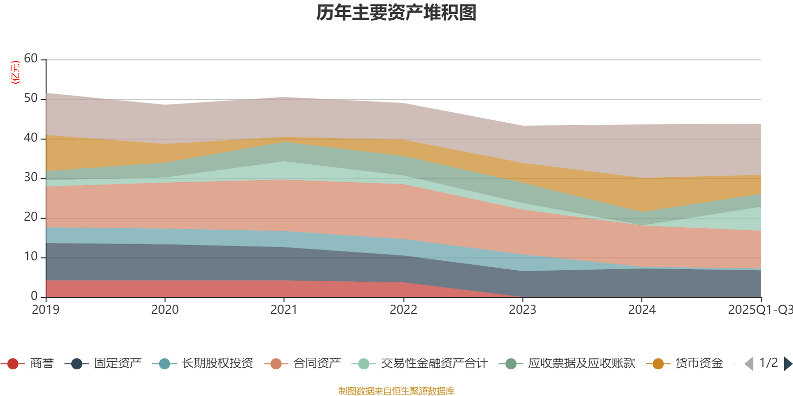 资产重大变化方面,截至2025年三季度末,公司交易性金融资产合计较上年末增加1786834.5%,占公司总资产比重上升13.78个百分点;货币资金较上年末减少44.51%,占公司总资产比重下降8.86个百分点;一年内到期的非流动资产较上年末减少49.02%,占公司总资产比重下降2.3个百分点;合同资产较上年末减少8.13%,占公司总资产比重下降2.04个百分点。