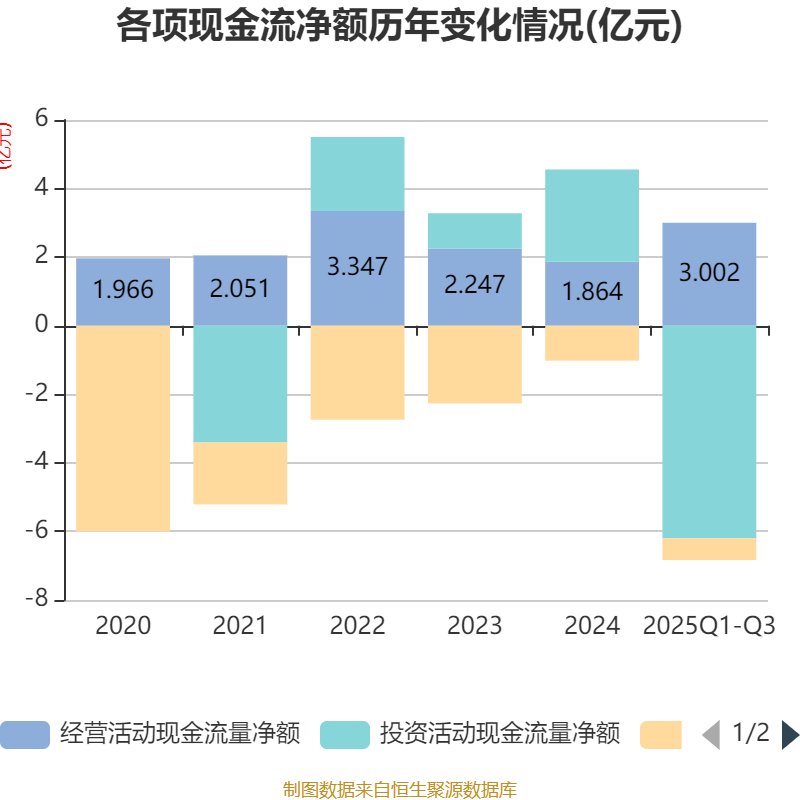 2025年前三季度,公司经营活动现金流净额为3亿元,同比增长66.16%;筹资活动现金流净额-6340.85万元,同比增加2591.03万元;投资活动现金流净额-6.2亿元,上年同期为-2.42亿元。