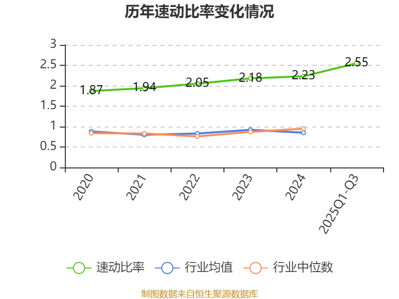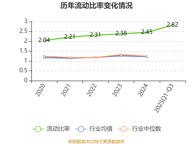 2025年前三季度,公司流动比率为2.82,速动比率为2.55。