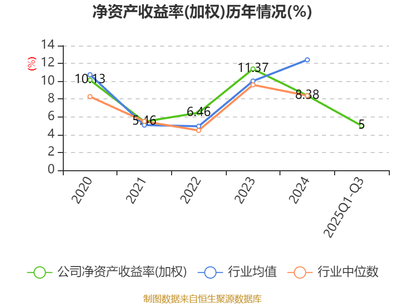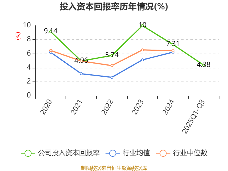 盈利能力方面, 2025年前三季度公司加权平均净资产收益率为5%,同比下降1.73个百分点。公司2025年前三季度投入资本回报率为4.38%,较上年同期下降1.57个百分点。