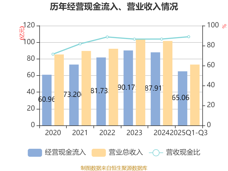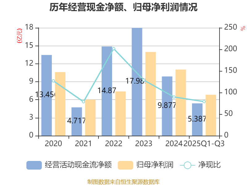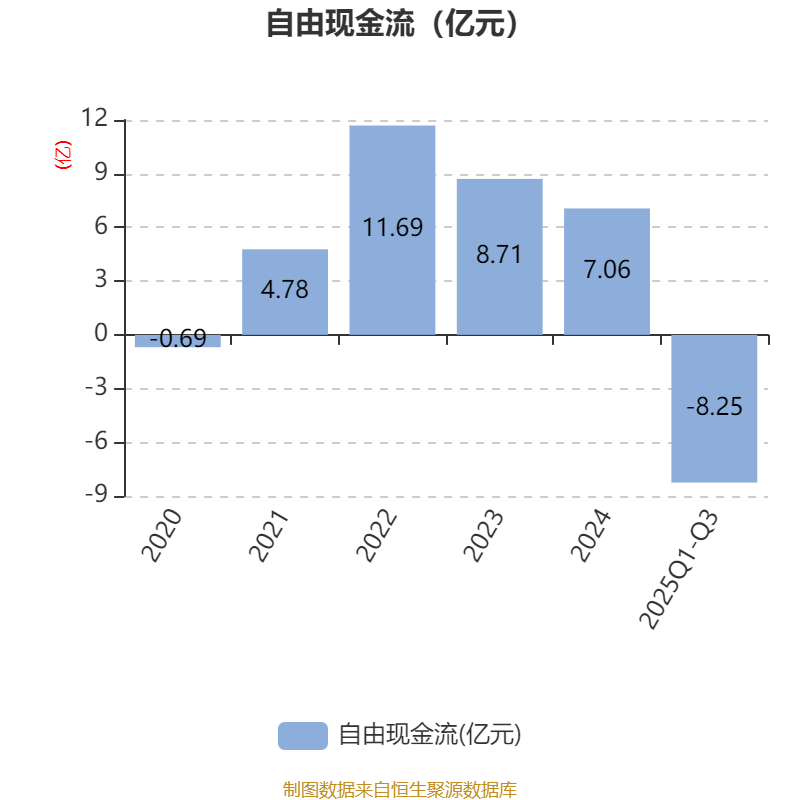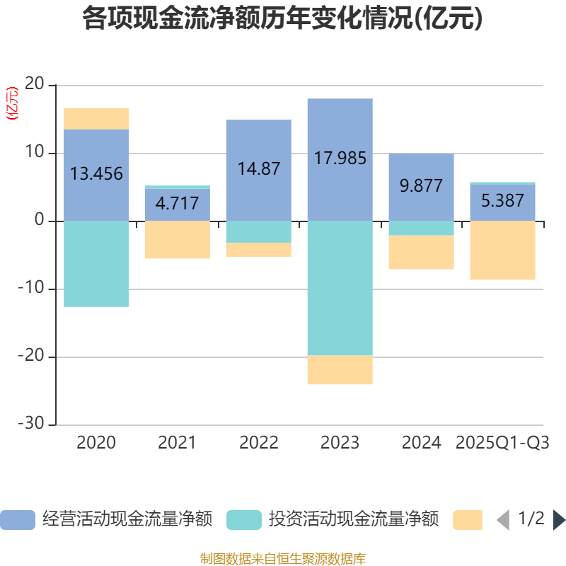 2025年前三季度,公司经营活动现金流净额为5.39亿元,同比下降29.6%;筹资活动现金流净额-8.68亿元,同比减少2.4亿元;投资活动现金流净额2855.41万元,上年同期为-1.6亿元。