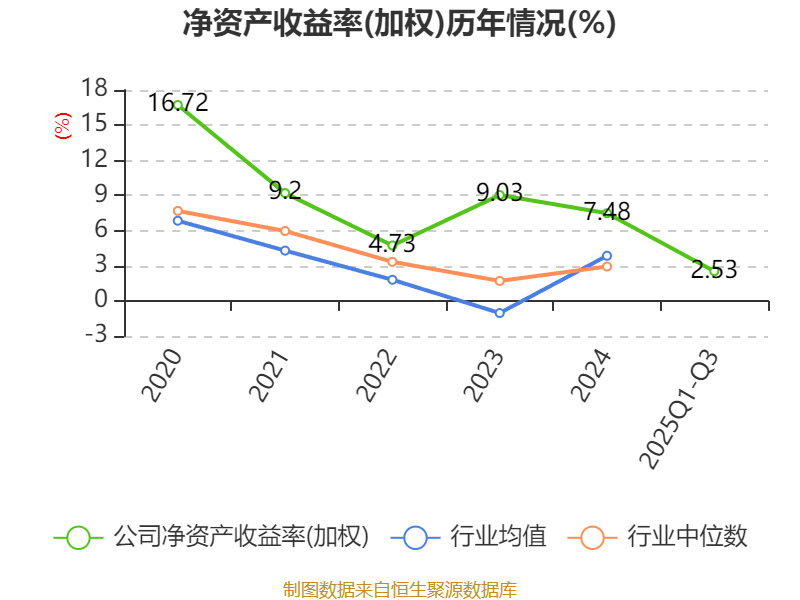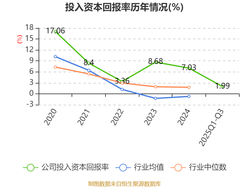 盈利能力方面, 2025年前三季度公司加权平均净资产收益率为2.53%,同比下降2.22个百分点。公司2025年前三季度投入资本回报率为1.99%,较上年同期下降2.56个百分点。